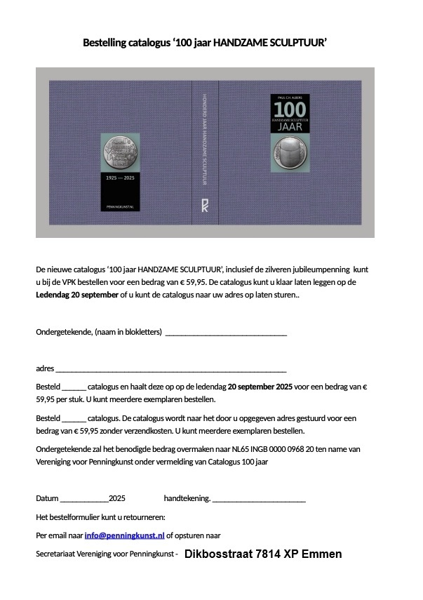 De nieuwe catalogus ‘100 jaar HANDZAME SCULPTUUR’, inclusief de zilveren jubileumpenning kunt u bij de VPK bestellen voor een bedrag van € 59,95. De catalogus kunt u klaar laten leggen op de Ledendag 20 september of u kunt de catalogus naar uw adres op laten sturen..